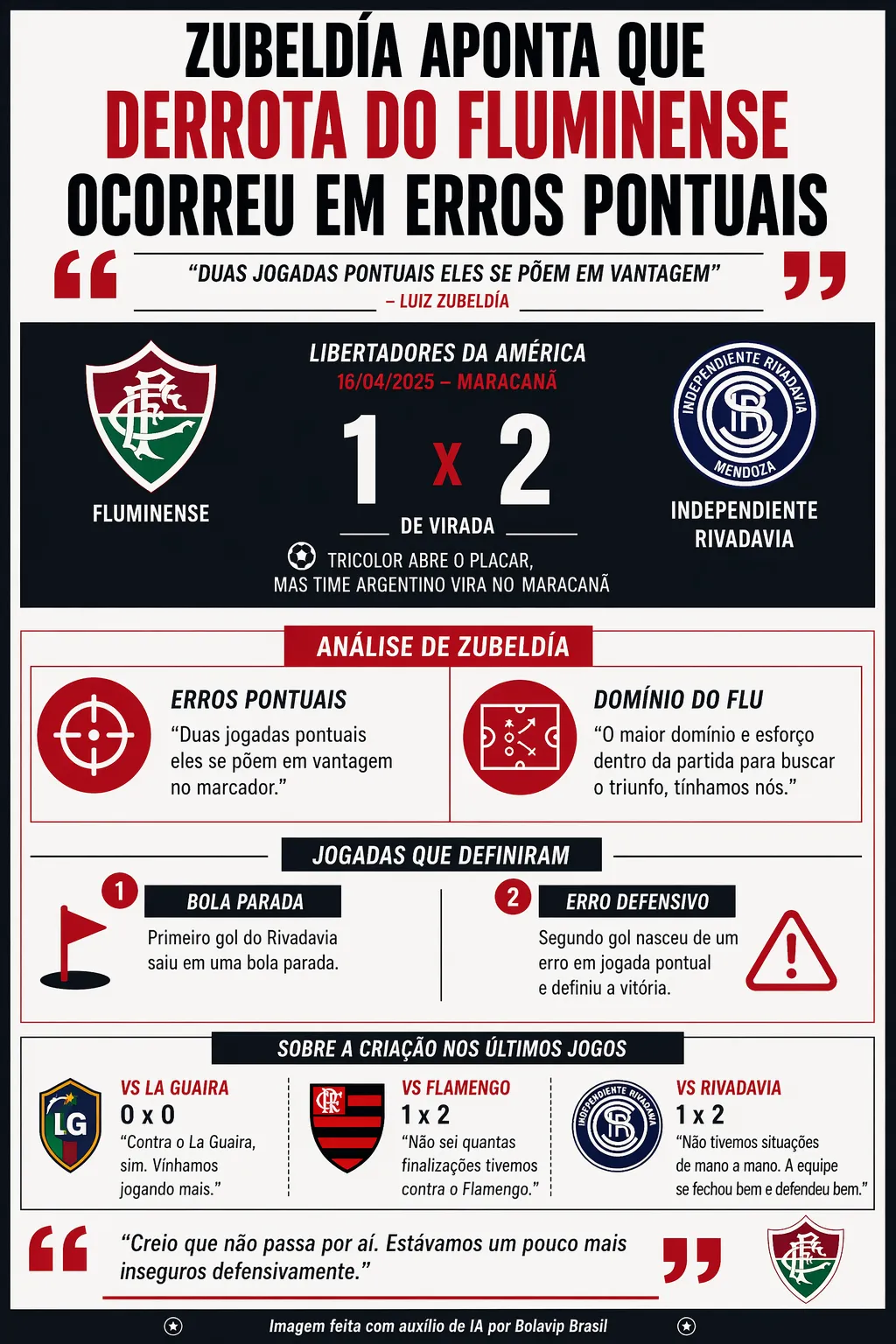 O Fluminense sofreu uma virada para o Independiente Rivadavia por 2 a 1, em duelo disputado no Maracanã na última quarta-feira (16), válido pela Libertadores. Com os erros cometidos na partida, o técnico Luiz Zubeldía avaliou o jogo ainda em campo.
