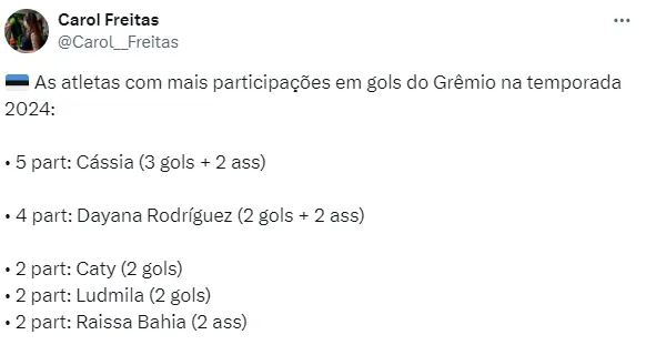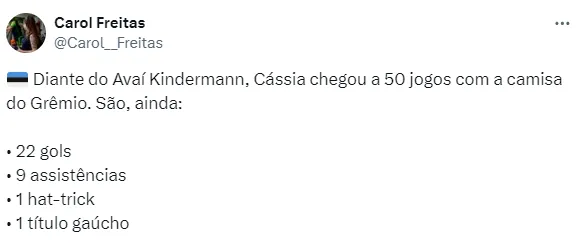 Após o triunfo, a atacante comemorou. “Fiquei muito feliz em poder marcar 2 gols e poder contribuir com 1 assistência, fico feliz em poder ajudar minha equipe nos resultados positivos dos jogos”, disse Cássia, que anotou um gol contra o Fluminense.