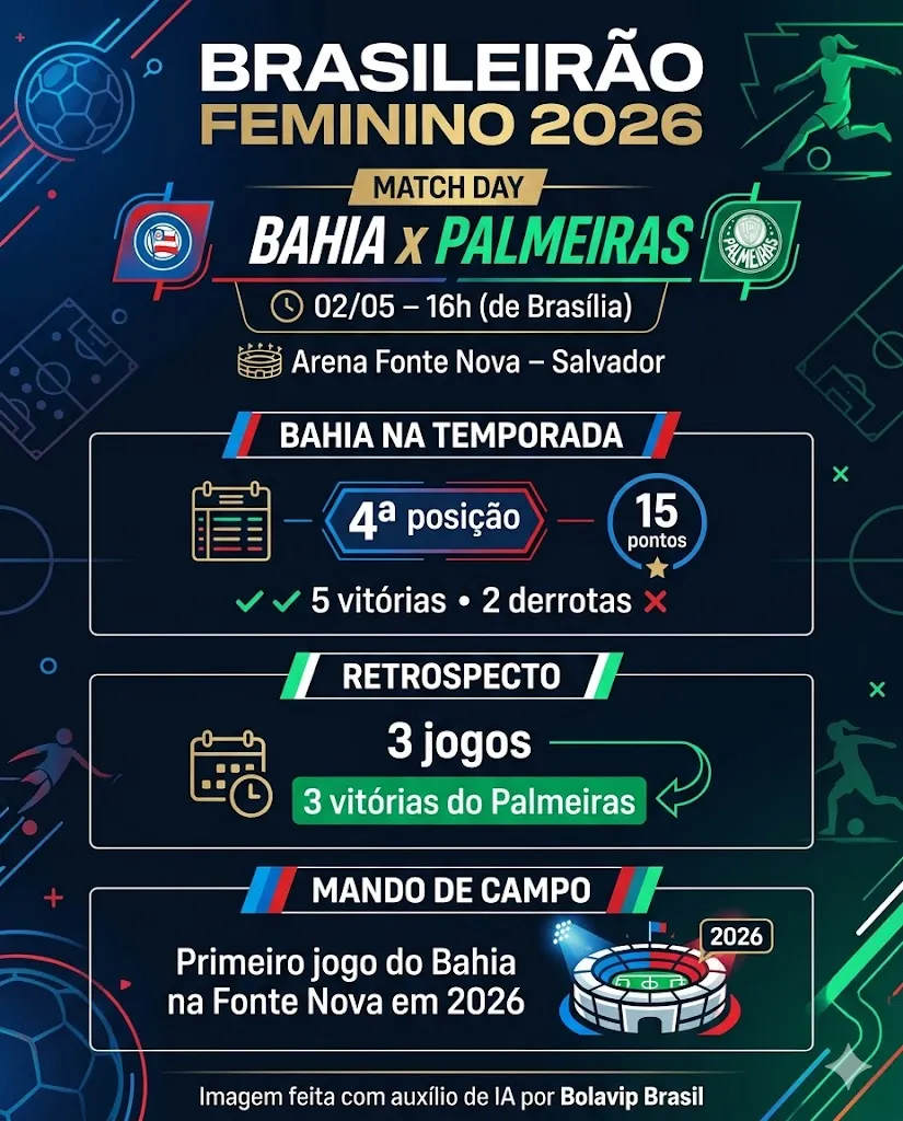 O Bahia confirmou que a Arena Fonte Nova, em Salvador, vai receber o confronto contra o Palmeiras, no dia 2 de maio, às 16h (de Brasília), válido pela nona rodada do Brasileirão Feminino.