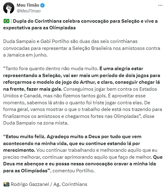 Duda destacou a mentalidade da equipe. “Mas isso é Corinthians: lutar até o final. Quando empatamos, sentíamos o cansaço, as pernas doendo, mas dava para ir até o final”, analisou a meio-campista.