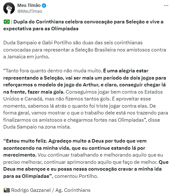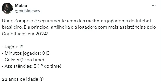 Duda Sampaio também destacou a temporada do Corinthians. “Nessa competição já aconteceu de tudo. Começamos perdendo, tomamos gol no segundo tempo e hoje fizemos uma virada ali no finalzinho”, disse ela.