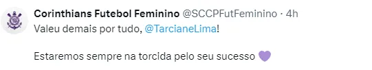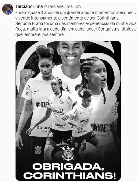 Tarciane, contratada em 2021, deixa o Corinthians depois de 76 jogos e dez títulos conquistados. Foi nesse período que a atleta passou a ser convocada regularmente para a Seleção Brasileira.