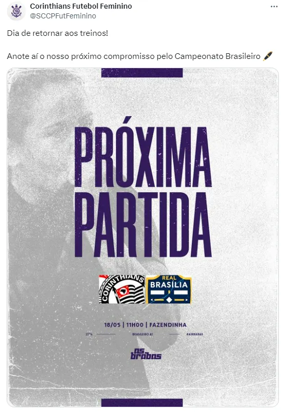 O confronto será diante do Real Brasília, no sábado (18). A partida acontecerá às 11h (horário de Brasília). A partida é pela 11ª rodada do Brasileirão Feminino. O Corinthians é líder, com 28 pontos.