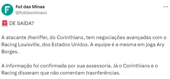 Isso porque, conforme informações do portal Fut das Minas, a atacante Jheniffer recebeu sondagens do Racing Louisville, dos Estados Unidos. O clube já tem uma brasileira no elenco: Ary Borges, ex-Palmeiras.