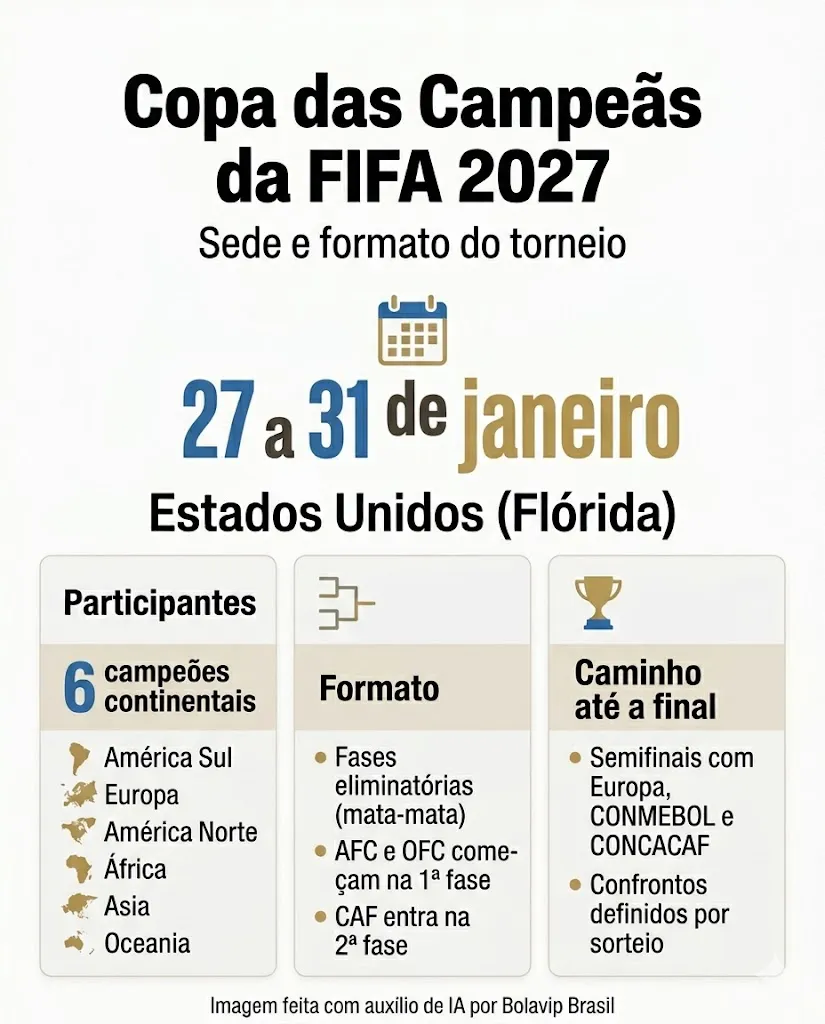 A cidade de Miami, nos Estados Unidos, foi escolhida para sediar a fase final da segunda edição da Copa das Campeãs da FIFA, torneio que reúne os clubes campeões continentais. A competição será realizada de 27 a 31 de janeiro de 2027 e pode ter brasileiras.