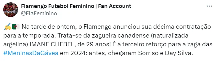 O Flamengo anunciou mais uma novidade para a temporada de 2024. O clube carioca surpreendeu os torcedores e anunciou a contratação da zagueira Imane Chebel.