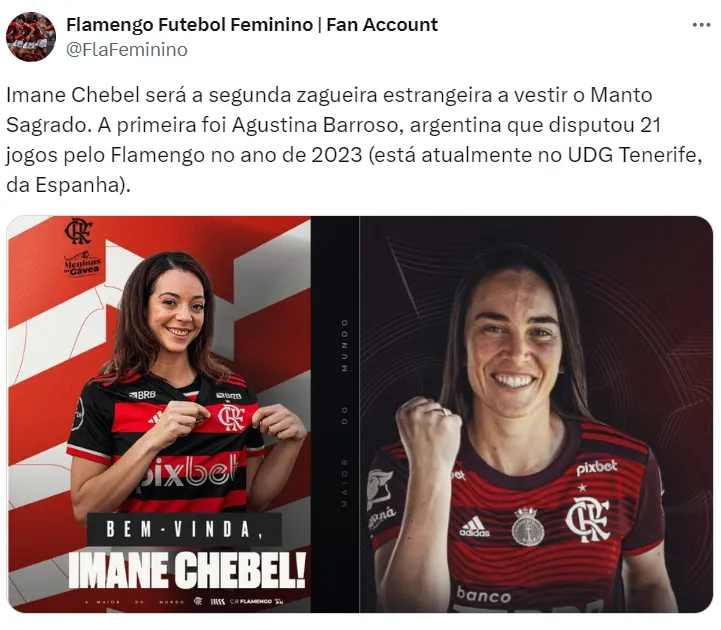 “Na minha carreira, eu considero essa vinda para o Flamengo uma grande oportunidade. Aqui, vou jogar com grandes jogadoras em um país tradicional e de alto nível técnico”, comentou Imane Chebel.