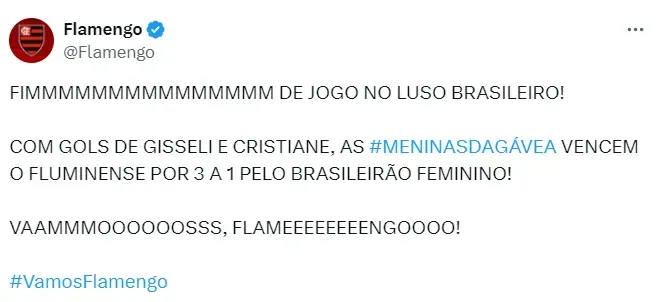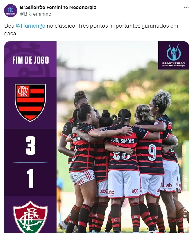 Nesta segunda-feira (13), a equipe rubro-negra entrou em campo diante do Fluminense, no Estádio Luso-Brasileiro. A partida terminou em 3 a 1, com gols da vice-artilheira Cristiane, duas vezes, e Gisseli. Carol Chaves diminuiu.