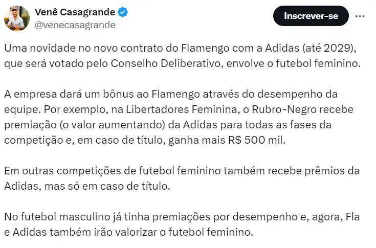 Segundo informações de Venê Casagrande, a marca esportiva irá passar a premiar as Meninas da Gávea por seu desempenho, assim como já acontece no futebol masculino.