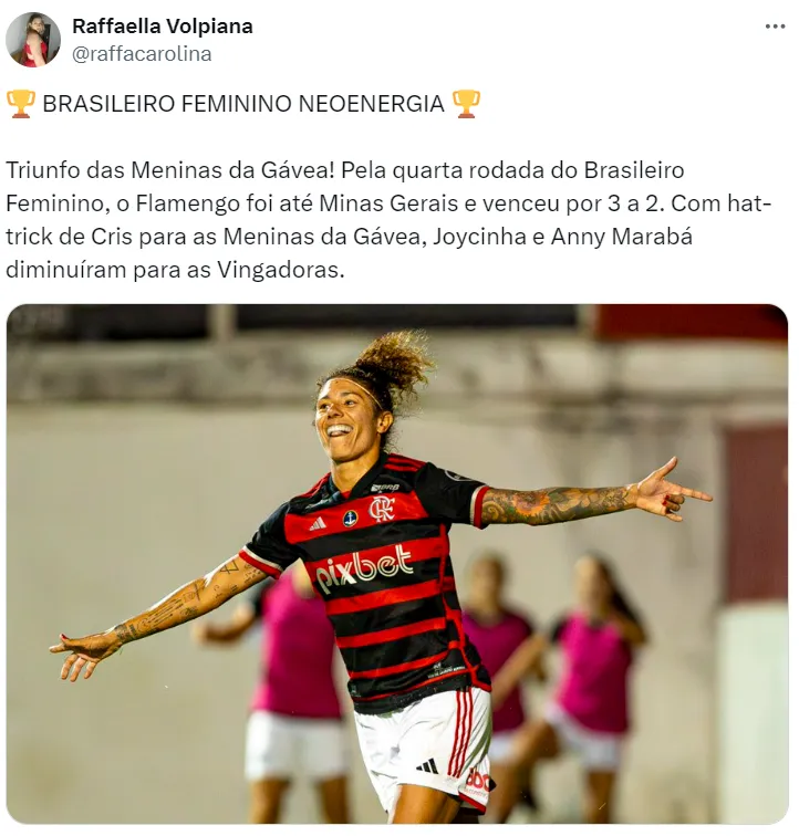 Cristiane, inclusive, é um dos maiores destaques do Flamengo neste início de temporada. A atacante, que estava no Santos no ano passado, é a artilheira do Brasileirão Feminino.