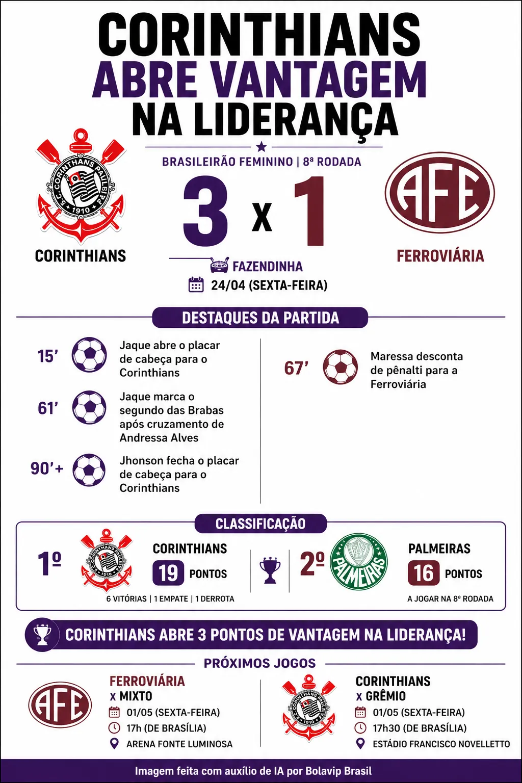 O Corinthians segue na liderança do Brasileirão Feminino. A equipe alvinegra venceu a Ferroviária por 3 a 1 na sexta-feira (24), na Fazendinha, na abertura da oitava rodada da competição.