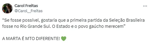 Marta, que vai se aposentar da seleção brasileira em 2024, também fez um pedido especial: que o jogo de abertura seja no Rio Grande do Sul, por conta da tragédia das chuvas e enchentes.