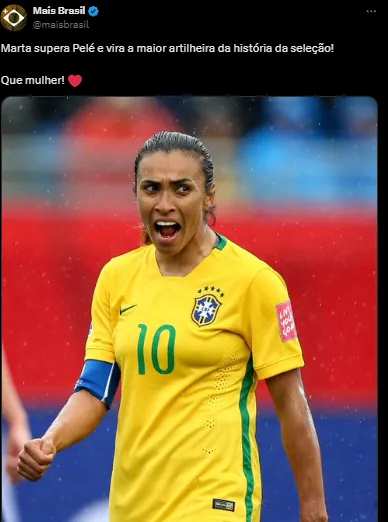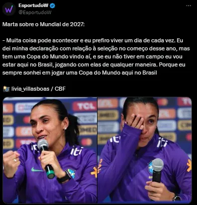 “Porque eu sempre sonhei em jogar uma Copa do Mundo aqui no Brasil”, completou Marta, que estará com 41 anos no Mundial de 2027. Mediante a um pedido especial, a atacante pode disputar a sua sétima Copa do Mundo.