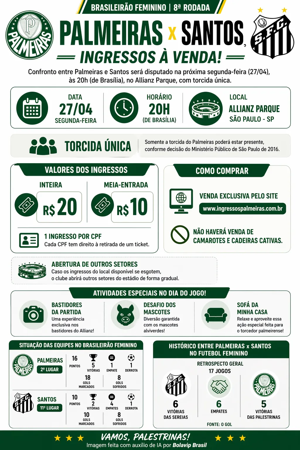 Os ingressos para o clássico entre Palmeiras e Santos, válido pela oitava rodada do Brasileirão Feminino, já estão à venda. Com torcida única, as equipes vão se enfrentar na próxima segunda-feira (27), às 20h (de Brasília), no Allianz Parque.