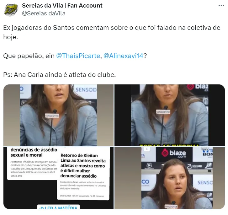 “Acho que é pior. Eu entenderia o papel dela se ela falasse que foi uma decisão do Santos trazê-lo de volta, o que ‘passou, passou’, está na justiça e lá será resolvido […] Agora, ela colocar a cara para falar isso sem nem ouvir o outro lado da história“, completou. A jogadora disse que não admira mais a coordenadora.