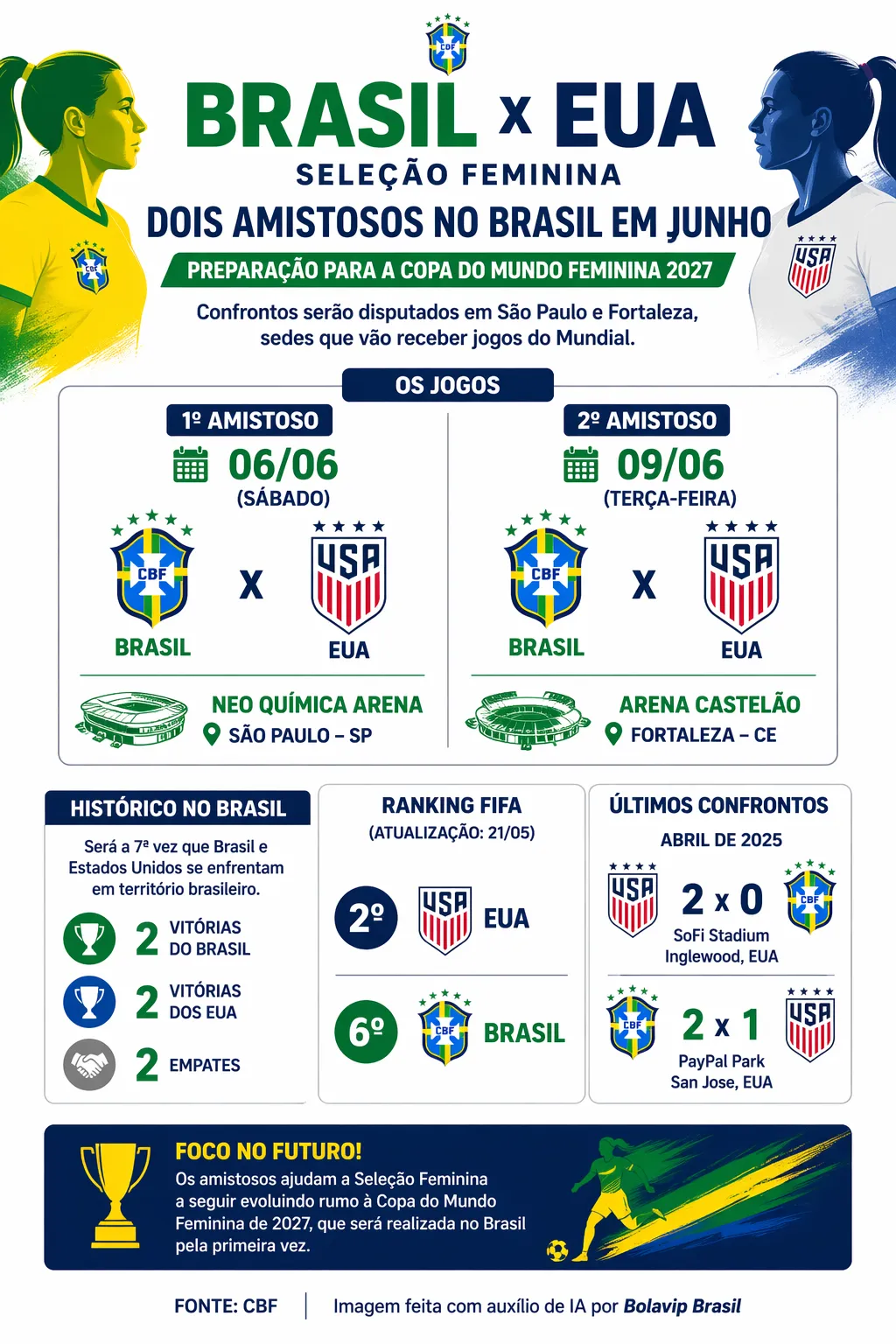 A Seleção Brasileira Feminina vai disputar dois amistosos contra os Estados Unidos no mês de junho, no Brasil. Os confrontos fazem parte da preparação para a Copa do Mundo de 2027, que será realizada no país pela primeira vez.