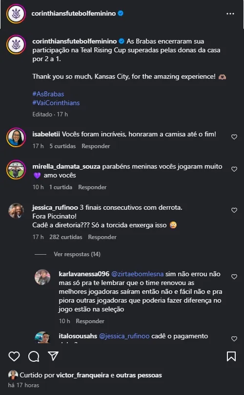 As críticas foram intensas e diretas: “AS BRABAS SÃO INCRÍVEIS. Mas temos que concordar, que o Piccinato não é técnico para o Corinthians”, escreveu um torcedor. “3 finais consecutivas com derrota. Fora Piccinato!”, disparou outro.