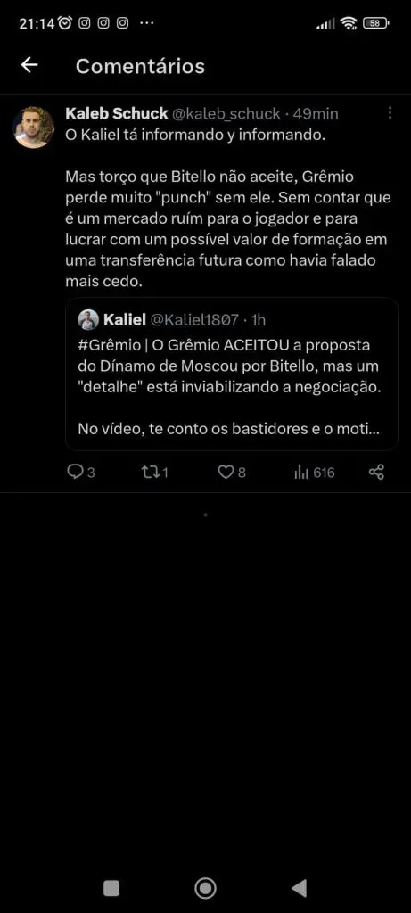 De acordo com o jornalista Kaliel Dorneles, a diretoria gremista aceitou a proposta do Dínamo de Moscou e está decidida a vender o jogador de 23 anos ao clube russo: 10 milhões de euros (R$ 53 milhões na cotação atual) por 100% dos direitos econômicos. Porém, ainda segundo o repórter, falta um importante detalhe: convencer o atleta, que está reticente em se transferir para o futebol russo.