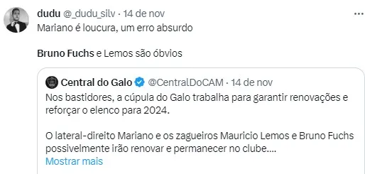 Começando com Fuchs, o zagueiro pode retornar após sofrer lesão na coxa esquerda, ele ainda não iniciou a fase de transição, mas com o tempo maior até enfrentar o Grêmio, ele pode voltar sim. Mariano também deverá reforçar o time após lesão muscular, de todos eles estão em um estágio mais avançado.
