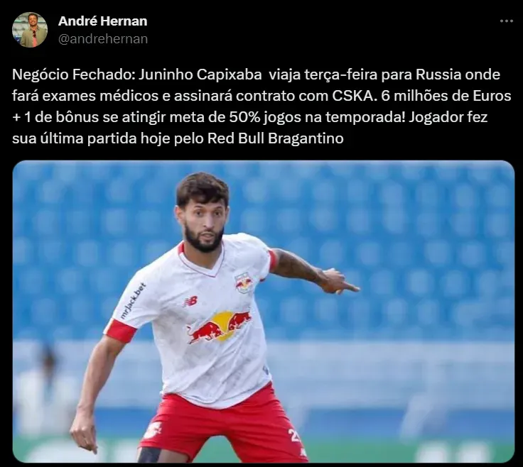 De acordo com a informação, o lateral-esquerdo Juninho Capixaba acertou sua ida ao futebol europeu. O jogador de 26 anos se tornará atleta do CSKA Moscou, após deixar o RB Bragantino. O jogador vai para o Velho-Continente por 6 milhões de euros mais bonificações.
