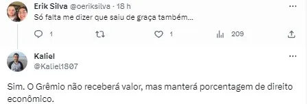 Ao ser questionado sobre valores, o jornalista Kaliel confirmou que o atacante deixou o time do Rio Grande do Sul de graça e só renderá algo aos cofres da equipe no futuro. “Sim. O Grêmio não receberá valor, mas manterá porcentagem de direito econômico”.