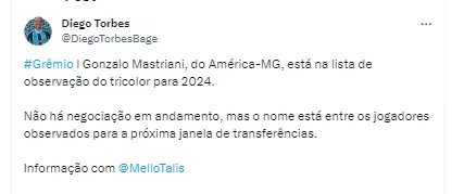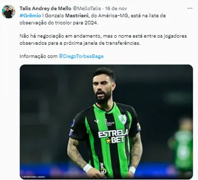 “Gonzalo Mastriani, do América-MG, está na lista de observação do tricolor para 2024. Não há negociação em andamento, mas o nome está entre os jogadores observados para a próxima janela de transferências”, informou o comunicador.