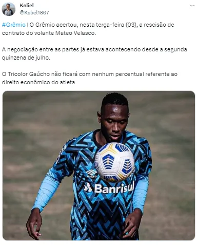“O Grêmio acertou, na última terça-feira (03), a rescisão de contrato do volante Mateo Velasco. A negociação entre as partes já estava acontecendo desde a segunda quinzena de julho. O Tricolor Gaúcho não ficará com nenhum percentual referente ao direito econômico do atleta”, informou Kaliel.