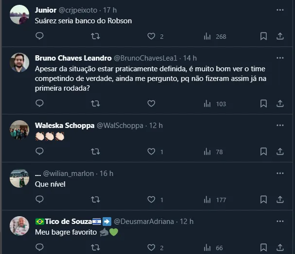 Dessa forma, como Suárez e Robson brilharam em suas respectivas partidas, os dois entraram para a Seleção da rodada do Brasileirão, feita pelo Sofascore, plataforma de estatísticas esportivas.