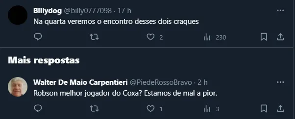 Até por isso, como os dois times irão se enfrentar na próxima quarta-feira (1), os torcedores alviverdes trataram de brincar com o “encontro de lendas” que teremos no Couto Pereira, ironizando a qualidade do camisa 30.