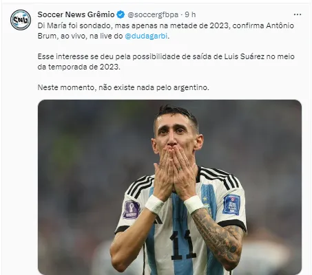 “Brum: Sobre o Di Maria, não tem nada. Quis deixar bem claro pra não criar falsa expectativa. O único contato que teve foi na metade do ano, quando achou que o Suárez iria sair. Ali, chegou a procurar informações dele para substituí-lo, mas ouviu que ele optou a ir pro Benfica por raízes que tem lá e acreditam que seu próximo clube será o Rosario, para encerrar onde começou”, finalizou o colega.