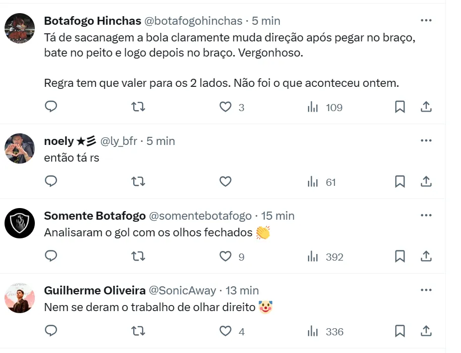 O diálogo da equipe de arbitragem e a cabine do VAR fez com que a torcida do Botafogo se indignasse ainda mais nas redes sociais.