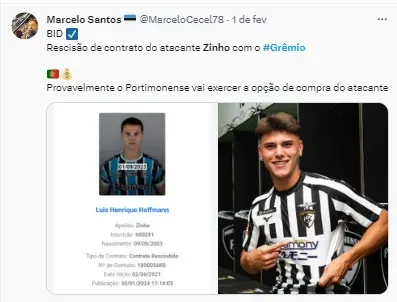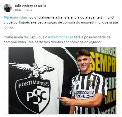“Grêmio Foot-Ball Porto Alegrense informa a transferência de parte dos direitos econômicos e cessão dos direitos federativos do atleta Zinho, formado nas categorias de base do Clube, ao Portimonense Sporting Clube”, publicou o Grêmio.