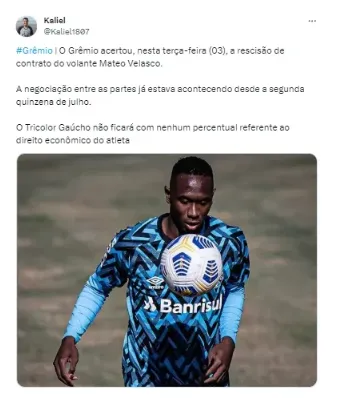 “O Grêmio acertou, na última terça-feira (03), a rescisão de contrato do volante Mateo Velasco. A negociação entre as partes já estava acontecendo desde a segunda quinzena de julho. O Tricolor Gaúcho não ficará com nenhum percentual referente ao direito econômico do atleta”, informou Kaliel.