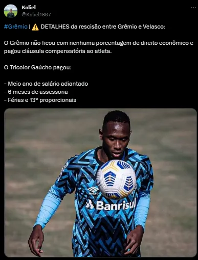 “Detalhes da rescisão entre Grêmio e Velasco: O Grêmio não ficou com nenhuma porcentagem de direito econômico e pagou cláusula compensatória ao atleta. O Tricolor Gaúcho pagou: meio ano de salário adiantado, seis meses de assessoria, além de férias e 13° proporcionais”, explicou Kaliel.