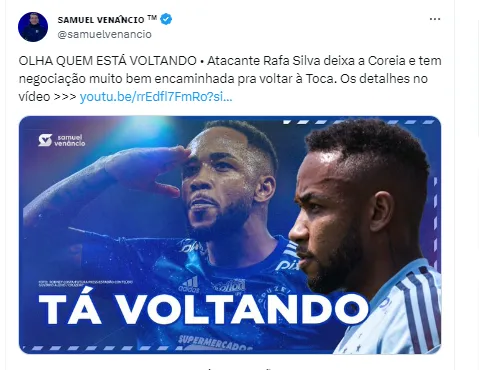 Em publicação nas suas redes sociais, Samuel Venâncio revelou que o jogador está voltando. ‘’Atacante Rafa Silva deixa a Coreia e tem negociação muito bem encaminhada pra voltar à Toca”.