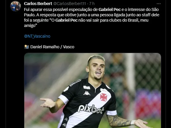 “O Gabriel Pec não vai sair para clubes do Brasil, meu amigo”, respondeu uma pessoa ligada ao staff em contato feito pelo colega Carlos Berbet, que acompanha os bastidores do que acontece de mais importante em São Januário e está sempre por dentro das melhores informações relacionadas à equipe da Colina Histórica.