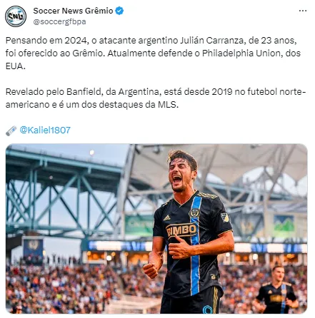 “Pensando em 2024, o atacante argentino Julián Carranza, de 23 anos, foi oferecido ao Grêmio. Atualmente defende o Philadelphia Union, dos EUA. Revelado pelo Banfield, da Argentina, está desde 2019 no futebol norte-americano e é um dos destaques da MLS”, publicou o perfil Soccer News Grêmio, seguindo as informações de Kaliel.