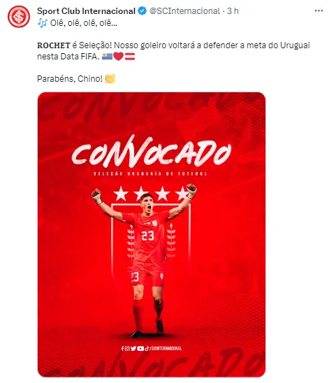 Na tarde desta segunda-feira (9), o goleiro se apresentou em Barranquilla, na Colômbia, para se juntar à concentração da seleção uruguaia que está hospedada no país para o jogo desta quinta-feira (12), contra a seleção da casa, pelas eliminatórias para a Copa do Mundo de 2026. Rochet é titular absoluto da seleção, e se não foi cortado, é que a lesão não era grave, portanto, não interferirá na sequência com o Inter.