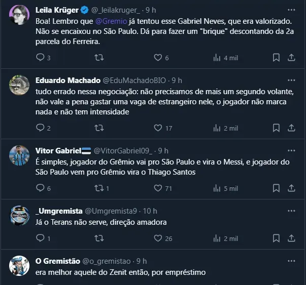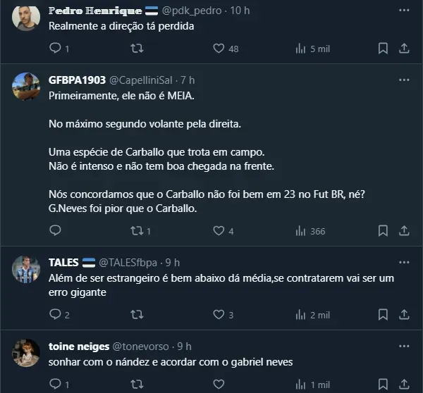 Por fim, como também possuí negociações com o volante Du Queiroz, o nome de Gabriel Neves causou polêmica na torcida do Grêmio, visto que dividiu opiniões e não foi muito bem aceito no Sul.