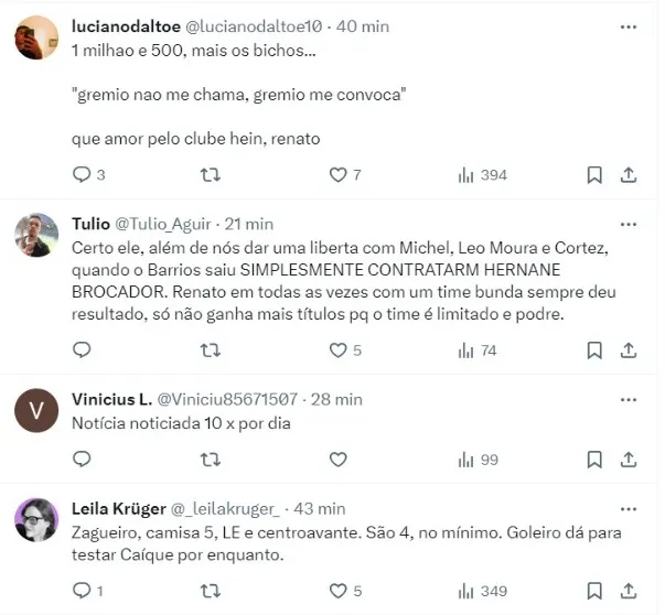Segundo a GZH, Renato quer um Grêmio com pelo menos três grandes reforços, ele já deixou claro a direção que a sua permanência está ligada diretamente ao o nível das contratações.