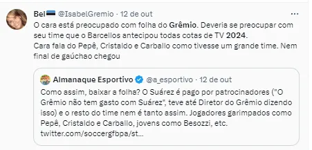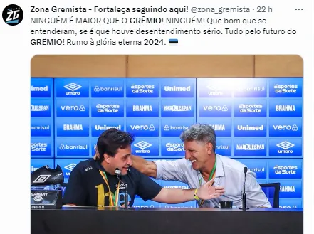 “Para 2024 vai ser a mesma coisa. O Suárez não tem substituto, mas o Grêmio vai ter um time muito competitivo na próxima temporada. Com investimento, reforços e também com as categorias de base. Ainda não concluímos o trabalho de 2023, mas não vejo razão alguma para que o Renato não seja o técnico em 2024. Não estou garantindo a permanência dele, já que ele pode ser assediado por outros clubes. Mas temos convicção nele”, revelou Eduardo Magrisso.