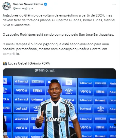 “O zagueiro Rodrigues está sendo comprado pelo San Jose Earthquakes. O meia Campaz é o único jogador que está sendo avaliado para uma possível permanência, mesmo com o desejo do Rosário Central em comprá-lo”, completou a informação.