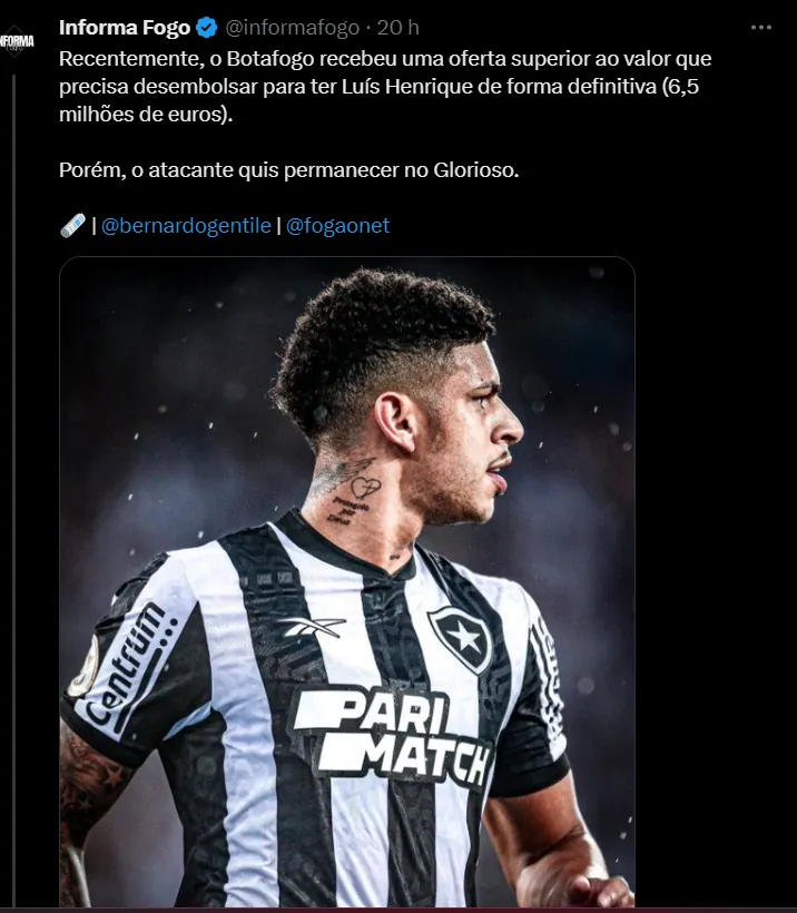 No entanto, o próprio jogador de 21 anos sacramentou qual camisa irá vestir. O atleta confirmou que continuará no Rio de Janeiro, sob o comando de Bruno Lage. A atitude do profissional foi muito elogiada pela torcida. “Mlk tem q ficar, vai nos levar até a Glória Eterna”, “Compra e mantém, mlk tem perfil de ídolo” e “Esse é botafoguense mesmo. Lembro de quando vi a notícia que ele estaria indo pro flamengo e fiquei realmente triste”.
