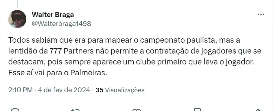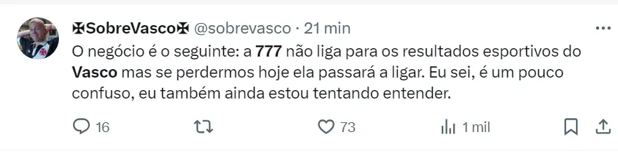 “Neste momento, a 777 está brecando duas contratações de atacantes que o Vasco havia realizado ou acertado. No mês passado, já havia contado que três jogadores importantes também foram brecados”, completou o jornalista neste domingo (4).