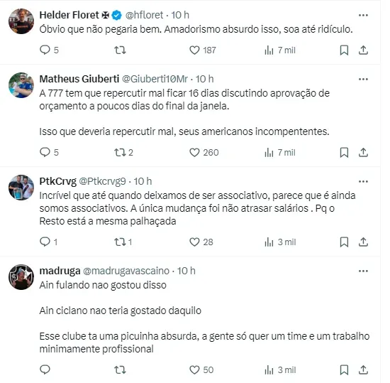 De acordo com o jornalista Joel Silva, do Atenção Vascaínos, a situação não caiu nada bem com a companhia, dona da SAF do Gigante da Colina. A informação é que há um incômodo muito grande com Alexandre Mattos.