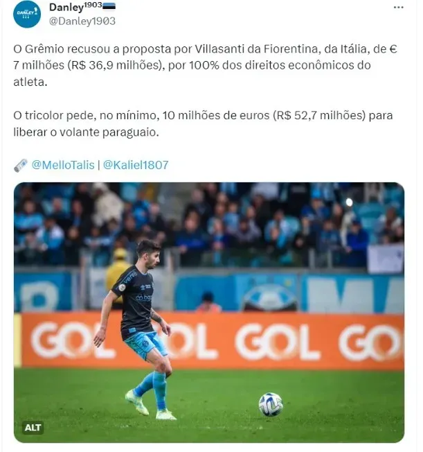 A Fiorentina apresentou uma oferta informal para tirar Villasanti do Grêmio. A proposta foi de 7 milhões de euros (R$ 36,9 milhões na cotação atual) por 100% dos direitos econômicos do atleta, de acordo com informações do jornalista Talis Mallo, em suas redes sociais.