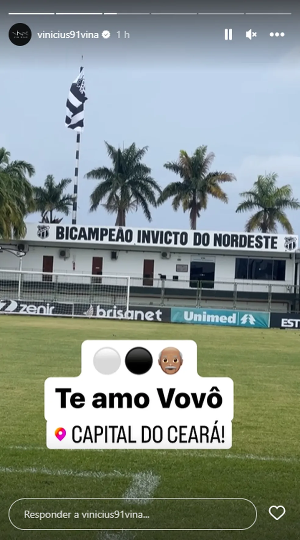 “Meu cantinho do agradecimento de ter tido a oportunidade de vestir essa camisa em todos os dias de treinamento. Te amo, Vovô, vocês são demais”, escreveu Vina. O meia estava no Ceará desde 2020 e sai do Clube com 168 jogos e 46 gols marcados. Pelo Clube foi campeão da Copa do Nordeste de 2020 e ganhou o Prêmio Craque do Brasileirão no mesmo ano.
