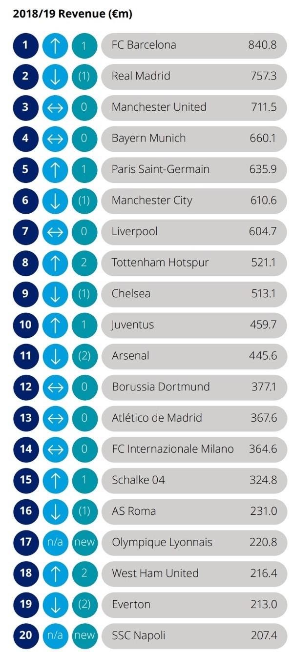 No topo da lista, o Barça é a principal novidade da análise. É a primeira vez, depois de 23 edições do relatório, que os Blaugranas lideram a lista. Ao alcançar uma marca inédita para o futebol mundial, a equipe de Lionel Messi e companhia superou o arquirrival, Real Madrid, para cravar mais uma vez o nome na história. O clube catalão alcançou, sem mais nem menos, aproximadamente € 841 milhões (cerca de R$ 4 bilhões na cotação atual) em receitas.