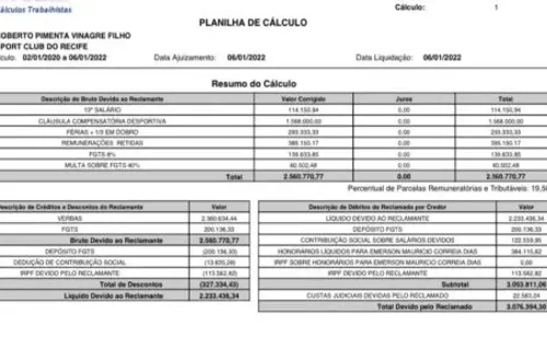 A bolada pedida pelo volante tem como maior parte, o valor da “Cláusula Compensatória Desportiva”, referente à multa rescisória do vínculo, que aponta para o montante de R$ 1,568 milhão. A ação de rescisão indireta faz com que Betinho requisite todos os salários que o Leão precisa lhe pagar até março de 2024, quando encerra o contrato do jogador na Ilha do Retiro. O salário do jogador é de R$ 60 mil por mês.