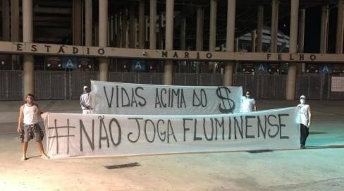 Na noite da última sexta-feira (29),um grupo de torcedores do Fluminense fizeram um grande protesto contra o retorno dos jogos do Campeonato Carioca durante à pandemia do novo coronavírus. Membros da torcida organizada ‘Young Flu’ foram até o Maracanã e mostraram um faixa com o dizer “vidas acima do dinheiro“. A informação é da equipe de reportagem do UOLEsporte.